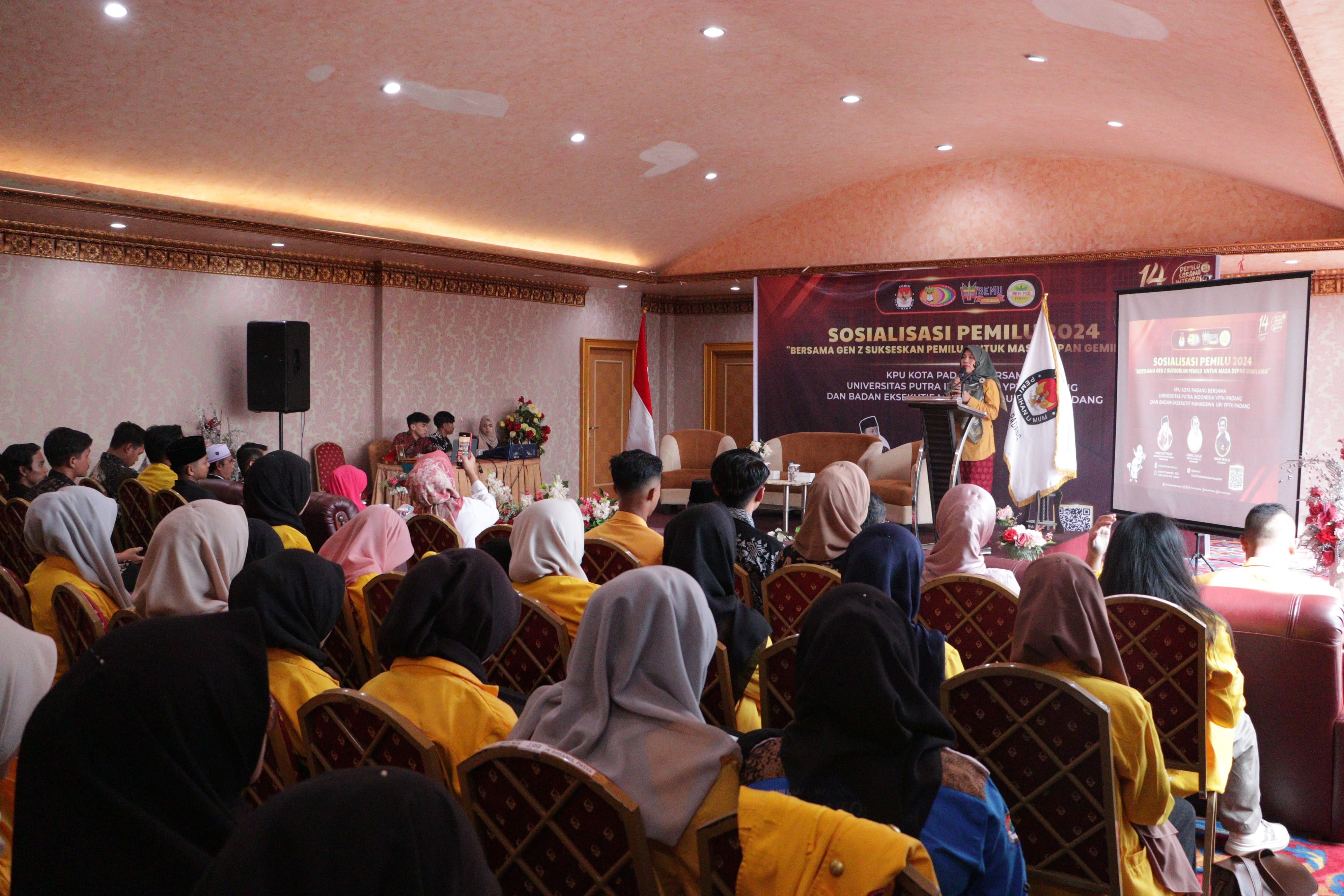 Sosialisasi Pemilu 2024 dengan Tema Bersama Gen Z Sukseskan Pemilu Untuk Masa Depan Gemilang ini diselenggarakan oleh KPU Kota Padang bekerjasama dengan BEM FEB UPI YPTK dan REMA UPI YPTK Padang di UPI Exhibition Hall Lantai 2.