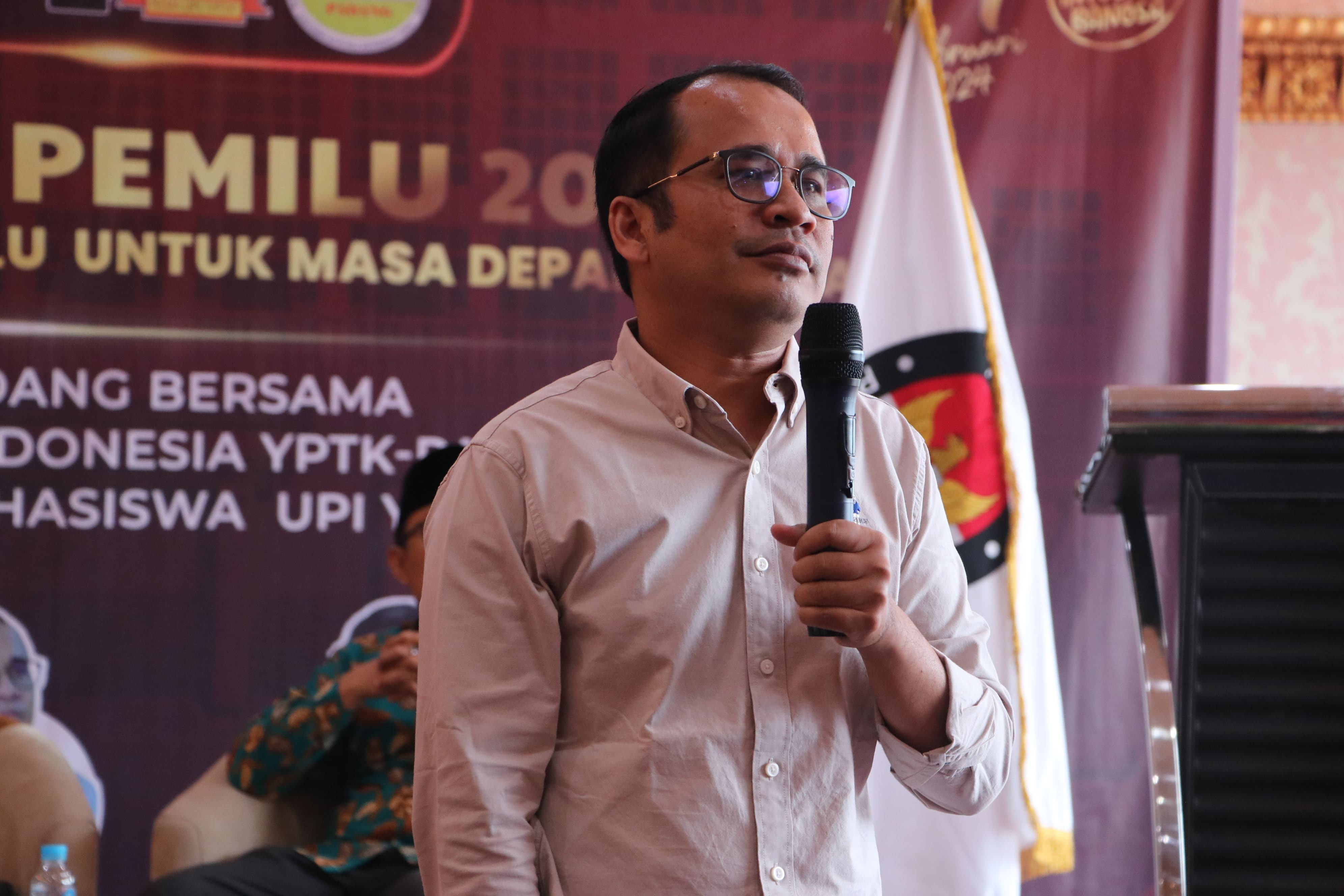 Hadir juga sebagai narasumber Praktisi Kepemiluan, Gabril Daulay. Gabril dalam pemaparan materi menyampaikan data dan fakta Pemilu 2024.