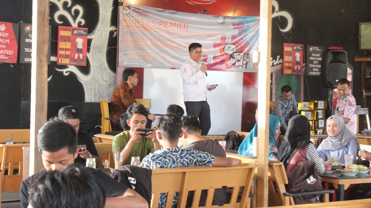 50 Animator Siap Bantu Kpu Padang Sosiasisasikan Pemilu 2019 PADANG-Komisi Pemilihan Umum (KPU) Kota Padang Rabu (19/12/2018) Kembali Melaksanakan Kursus Pemilu Dalam Rangka Meningkatkan Peran Masyarakat Serta Partisipasi Masyarakat Dalam Pemilu Tahun 2019. Dalam Kursus Pemilu Kali Ini KPU Kota Padang Mengundang Animator Kota Padang Yang Tergabung Dalam Kelompok Animator Dan Industri Kreatif Se-kota Padang Bersama AINAKI (Asosiasi Industri Animasi Dan Kreatif Indonesia). Kursus Pemilu Kali Ini Mengangkat Tema "Peran IT Dan Kelompok Kreatif Dalam Meningkatkan Partisipasi Pemilu 2019". Kegiatan Yang Dihadiri Oleh Komisioner KPU Kota Padang Mahyuddin Dan Chandra Eka Putra, Kasubag Teknis Dan Hupmas Sutrisno. Kegiatan Yang Diadakan Di Gubuk Cafe, Kuranji Padang. Kursus Pemilu Ini Di Moderatori Oleh Ketua Ainaki Taufik Gusman Dengan 2 Orang Narasumber Divisi Sosialisasi Dan Partisipasi Masyarakat KPU Kota Padang Mahyuddin Dan Agustian Piliang Kasubag Program Dan Data KPUSumbar. Mahyuddin Menyampaikan Bahwa Tujuan Pemilu Adalah Untuk Memilih Anggota DPR RI, DPD RI, DPRD Provinsi Dan DPRD Kabupaten/Kota Serta Presiden Dan Wakil Presiden. Nanti Pada Hari Pemungutan Suara Rabu 17 April 2019, WNI Yang Sudah Terdaftar Dalam Daftar Pemilih Akan Mendapatkan 5 Jenis Surat Suara. Mahyuddin Juga Memperagakan Spesimen Surat Suara Pemilu 2019 Dan Cara Memberikan Hak Pilih Di TPS. Dalam Kesempatan Itu, Agustian Piliang Dalam Materinya Mengajak Para Animator Se-kota Padang Siapapun Bisa Terlibat Dalam Poitik Dan Memiliki Penyampaian Yang Berbeda-beda, Peran Animator Dan Programmer Dalam Politik Sangatlah Besar Serta Ada 3 Hal Yang Harus Dikuasai Oleh Para Pegiat Animasi Dan Industri Kreatif Jika Ingin Mengambil Peran Dalam Tema-tema Kepemiluan. Pertama, Penguasaan Instrumen IT, Baik Hardware Maupun Software Animasi Dan Desain Kreatif. Kedua, Materi-materi Sosialisasi Tahapan Pemilu 2019. Ketiga, Sentuhan Seni Dalam Mengemas Materi Sosialisasi Pemilu Menjadi Produk Animasi, Sparkol Videoscribe Dan Desain Kreatif, Sehingga Mampu Mengemas Dan Menampilkan Materi-materi Yang Rumit Menjadi Bentuk Yang Sederhana Dan Mudah Dipahami Oleh Semua Kalangan. Ketua Ainaki Taufik Gusman Beserta Komunitasnya, Menyambut Baik Kegiatan Ini Dan Sangat Antusias, Sehingga Direncanakan Lomba Animasi Dan Desain Kreatif Tentang Pemilu 2019, Sebagai Tindak Lanjut Kegiatan Kursus Ini.Kegiatan Tersebut Diisi Oleh Narasumber Dari KPU Sumbar Agustian Piliang Kasubag Data Dan Program KPU Sumbar Dan Mahyudin Komisioner KPU Kota Padang Dan Dimoderatori Oleh Taufik Yang Merupakan Salah Seorang Kreator Muda Indonesia Yang Juga Dosen Di Politeknik Negeri Padang. [Media-Center.1]