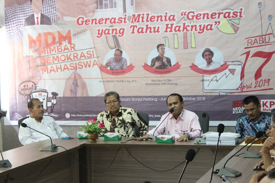 UNIVIERSITAS ISLAM NEGERI PADANG- Kegiatan KPU Kota Padang Dalam Agenda KPU GOES TO CAMPUS Yang Diselenggarakan Pada Jum’at (26/10/2018) Di Kampus UIN Imam Bonjol Padang Kegiatan Ini Diikuti Lebih Kurang 100 Orang Peserta Yaitu Melaksanakan Pendidikan Pemilih Untuk Pemula Dalam Pemilihan Umum Tahun 2019 Di Fakultas Syariah Universitas Islam Negeri Imam Bonjol Padang Jln. Prof. M. Yunus Lubuk Lintah Kel. Anduring Kec. Kuranji Kota Padang Dengan Mengangkat Tema Generasi Milenial "generasi Yang Tahu Hak Nya". Acara Yang Dimulai Pada Pukul 14.00 Wib Dihadiri Oleh Ketua KPU Kota Padang Drs. M Sawati M.Si, Komisioner KPU Kota Padang DivTeknis Candra Eka Putra, Komisioner KPU Div. Program Dan Data Yusrin Trinanda S.Ip, Komisioner KPU Kota Padang Div. Logistik Mahyudin S.Ag, Dekan Fakultas Syariah Efrinaldi M.Ag, Dosen Fakultas Syariah UIN Abrar M.Ag Yang Bertindak Sebagai Narasumber Bersama Dengan Komisioner KPU Kota Padang Riki Eka Putra A.md Dan Di Moderatori Oleh M. Taufik S.Ag M.Si pembukaan Acara Dilakukan Oleh Dekan Fakultas Syariah UIN Imam Bonjol Padang Dan Dilanjutkan Oleh Ketua KPU Kota Padang M. Sawati Yang Disambung Dengan Penandatanganan MOU Dan Penyerahan Plakat Antara KPU Kota Padang Dengan Fakultas Syari’ah UIN Imam Bonjol Padang. M. Sawati Menyampaikan Ucapan Terima Kasih Kepada Fakultas Syariah UIN Imam Bonjo Padang Telah Membuka Dan Memberi Waktu Kepada KPU Kota Padang Untuk Melaksanakan Kegiatan Ini, Dengan Adanya Penandatanganan MOU Ini KPU Kota Padang Akan Siap Serta Membuka Diri Untuk Kedepannya Kepada Seluruh Pihak UIN Dalam Melakukan Sosialisasi Untuk Mensukseskan Pemilu Tahun 2019 Dan Kerjasama Ini Akan Terus Berlanjut Untuk Kedepannya. keseruaan Mimbar Demokrasi Mahasiswa Hari Ini, Hal Ini Tidak Lepas Dari Peran Mohammad Taufik Sebagai Mederator, Dalam Memancing Pertanyaan Dan Isu-isu Aktual Seputar Generasi Milenia. Unutk Mensukseskan Pemilu Peran Penting KPU Sebagai Penyelenggara Pemilu Betul-betul Terlaksana Mulai Dari Daerah Sampai Tingkat Pusat. Pendidikan Pemilih Untuk Pemula Yang Dilakukan Oleh KPU Kota Padang Terhadap Suara Generasi Milenial Sangat Berpengaruh Terhadap Elektabilitas Peserta Pemilu Tahun 2019 Mulai Dari Pileg Dan Pilres. Generasi Milenial Lebih Kurang 40 Persen Dari Jumlah DPT Namun Banyak Yang Acuh Tidak Acuh Dengan Pemilu, Oleh Karena Itu KPU Kota Padangdianggap Perlu Untuk Melakukan Sosialisasi Kepada Mahasiswa Dan Dosen Di Kampus-kampus Yang Ada Di Kota Padang. Riki Eka Putra Sebagai Narasumber Menyampaikan Materi Dan Mengajak Seluruh Peserta Untuk Berdiskusi Dalam Tanya Jawab "generasi Milenial Generasi Yang Tau Hak Nya’ Siapa Itu Generasi Milenial? Generasi Milenial Adalah Dibuat Untuk Mendevenisikan Pada Saat Pemilu Tahun 2019 Nanti Pertama Kali Melakukan Pemilihan Umur 17 Tahun Sampai Dengan Umur 35 Tahun. Dilihat Dari Perspektif Politik Generasi Milenial Sangat Berpengaruh Dalam Pemilu Tahun 2019.Tantangan Generasi Milenial. Pada Pemilu Tahun 2014 Pemilu Legislatifdilaksanakan Ada Jarak 2 Bulan Setelah Itu Baru Dilaksanakan Pilpres Kemudian Pemilu Tahun 2019 Ini Pemilu Dilaksanakan Serentak Maka Menjadi Tantangan Bagi Pemilih Pemula Karena Memilih 5 Surat Suara DPRD Kab/Kota, DPRD Prov. DPR RI. DPD Dan Pilpres. Generasi Milenial Harus Membangun Budaya Politik Yang Lebih Sehat. [Media-Center.1]