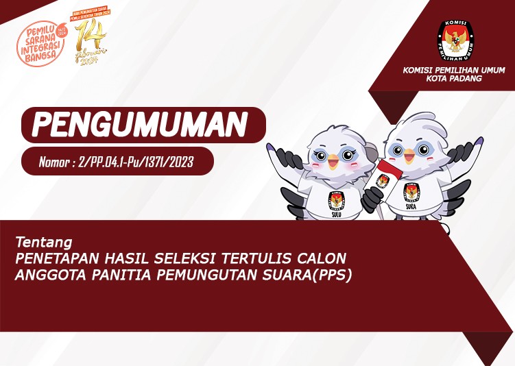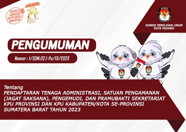 PENGUMUMAN NOMOR: 1 /SDM.02.1-Pu/13/2023 TENTANG LOWONGAN PENDAFTARAN TENAGA ADMINISTRASI, SATUAN PENGAMANAN (JAGAT SAKSANA), PENGEMUDI, DAN PRAMUBAKTI SEKRETARIAT KOMISI PEMILIHAN UMUM PROVINSI SUMATERA BARAT DAN SEKRETARIAT KOMISI PEMILIHAN UMUM KABUPATEN/KOTA SE-PROVINSI SUMATERA BARAT TAHUN 2023